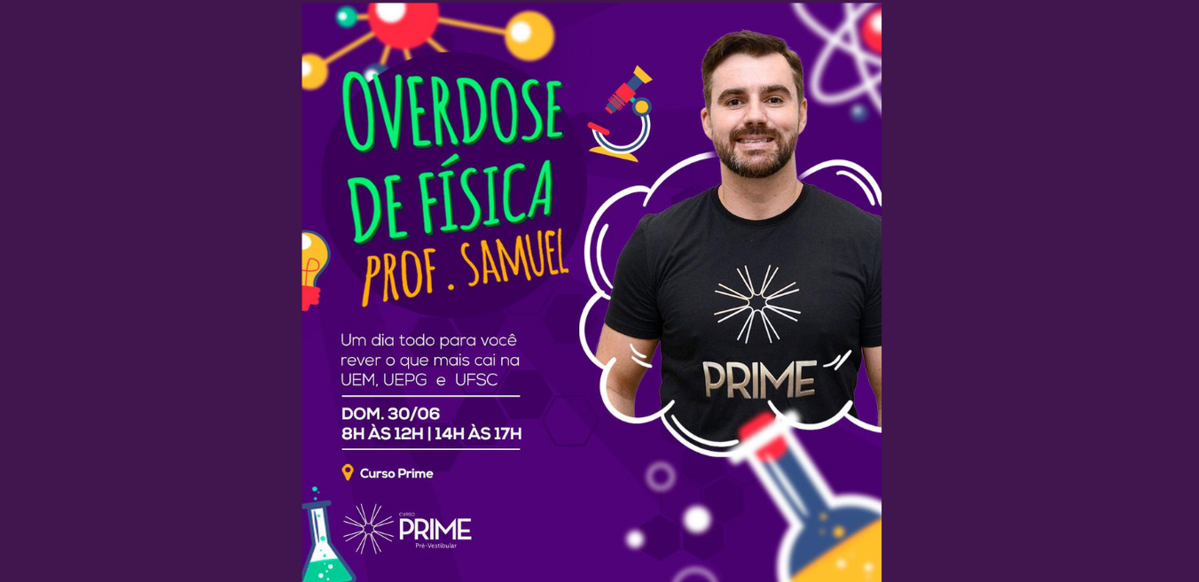 O Prime promove no dia 30 de junho o plantão “Overdose de Física”, com o professor Samuel Savinski. Durante dois períodos, das 8 às 12 horas e das 14 às 17 horas, o professor vai abordar assuntos mais cobrados em Física nos vestibulares da Universidade Estadual de Maringá (UEM), Universidade Estadual de Ponta Grossa (UEPG) e Universidade Federal de Santa Catarina (UFSC). “Elaborei o plantão com base em uma pesquisa realizada nas provas aplicadas desde 2016”, revela. As inscrições podem ser feitas pelo fone/whatsapp (43) 3025-1020.